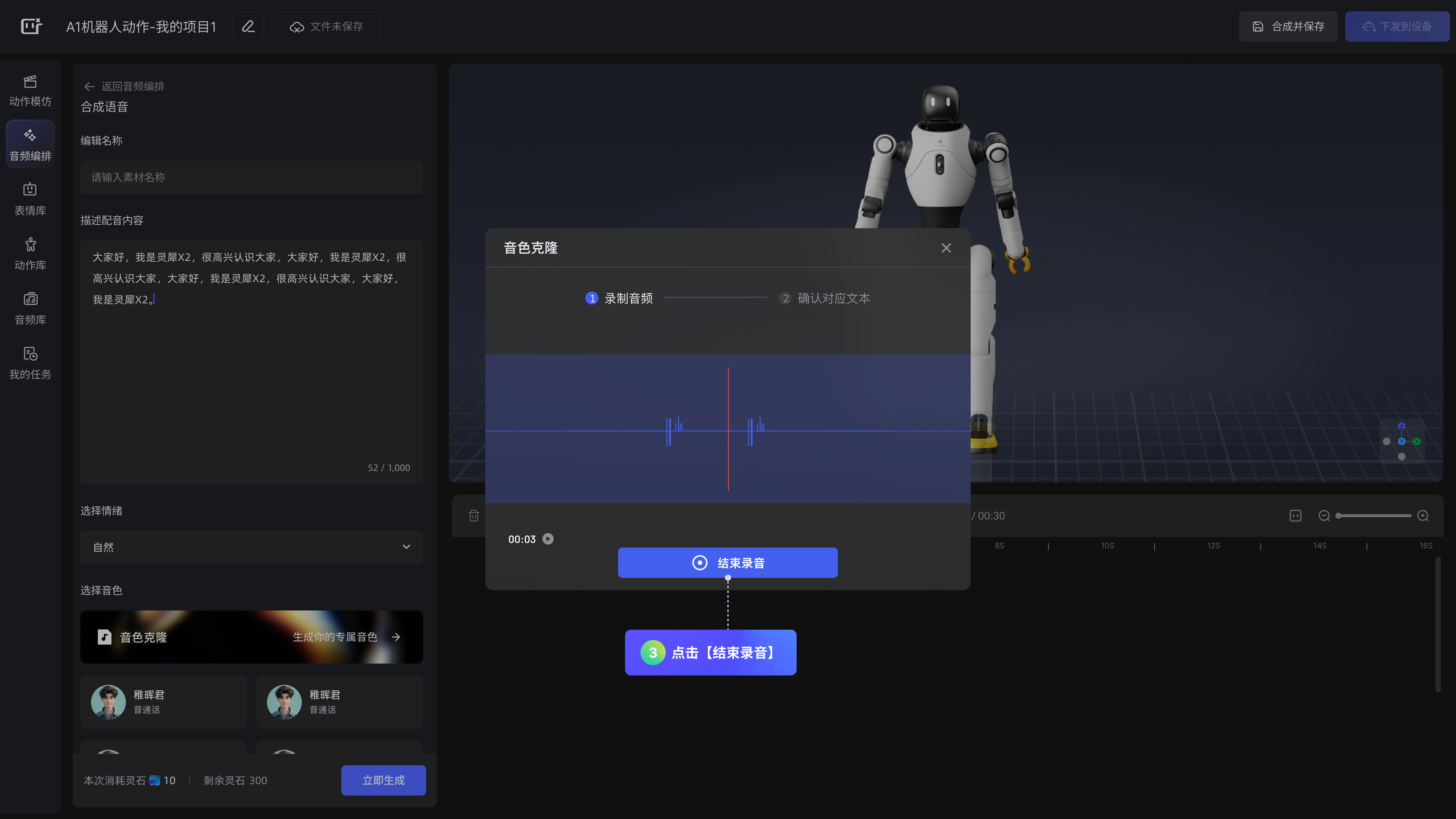 3「语音演绎」:支持对上传音频及麦克风录制音频进行智能识别,基于识别结果,可使用「一键编排」功能,自动为音频匹配并插入对应动作与表情;同时也支持用户手动进行个性化编排。