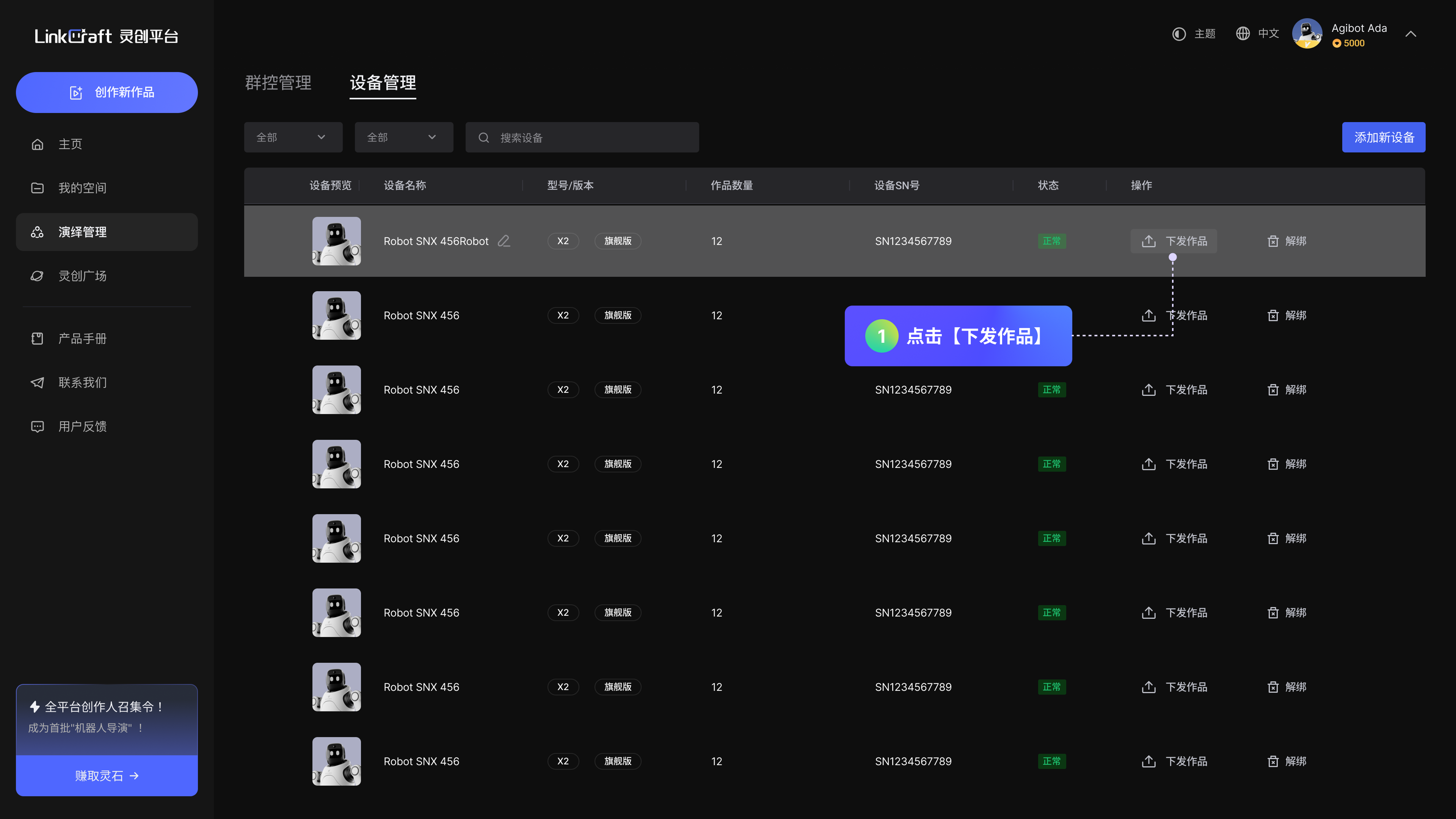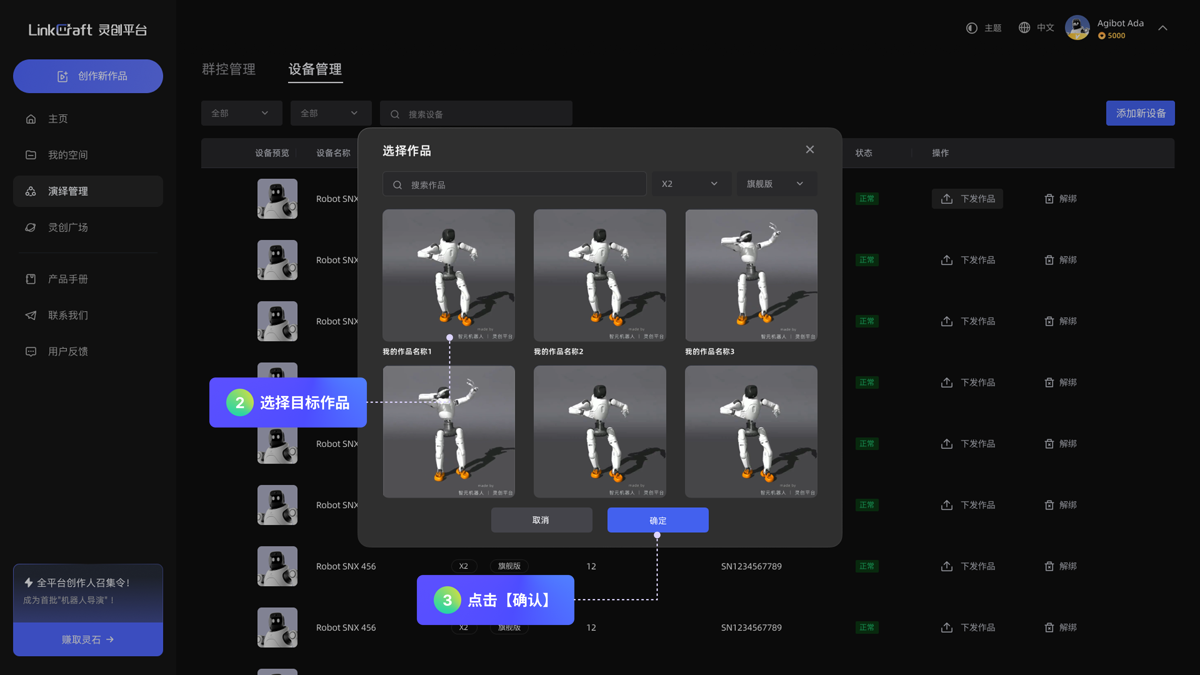 「演绎管理」:内含「设备管理」和「群控管理」两部分功能。「设备管理」用于查看机器人信息,绑定和管理机器人设备;「群控管理」用于创建并管理多设备同步的演绎任务,实现多台机器人协同表演或批量控制。